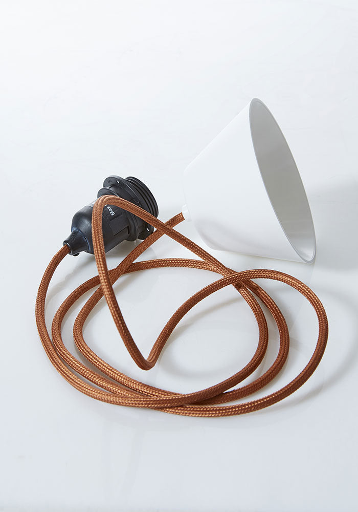 Ett takupphäng med textilklädd sladd, framtaget för att passa våra taklampskärmar med E27 fäste. Färgen "korall/koppar" är färgmatchad till våra taklampskärmar i korallfärgade tyger.