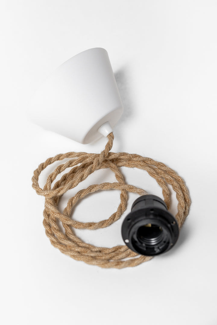 Ett takupphäng med textilklädd sladd, här tvinnad, framtaget för att passa våra taklampskärmar med E27 fäste. Färgen linne natur passar de flesta av våra taklampskärmar.